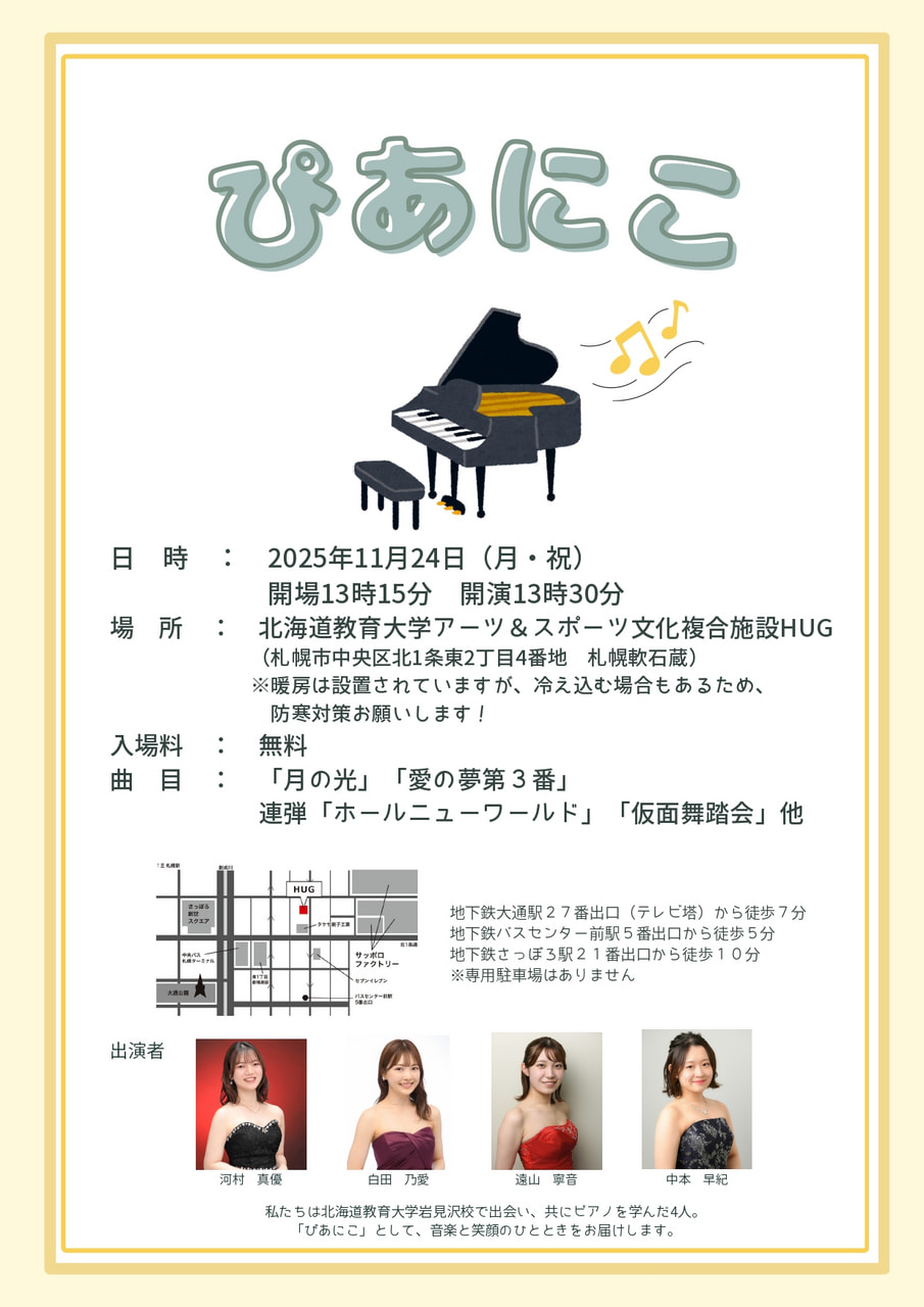 本学岩見沢校 音楽文化専攻の卒業生4名によるピアノ演奏会。