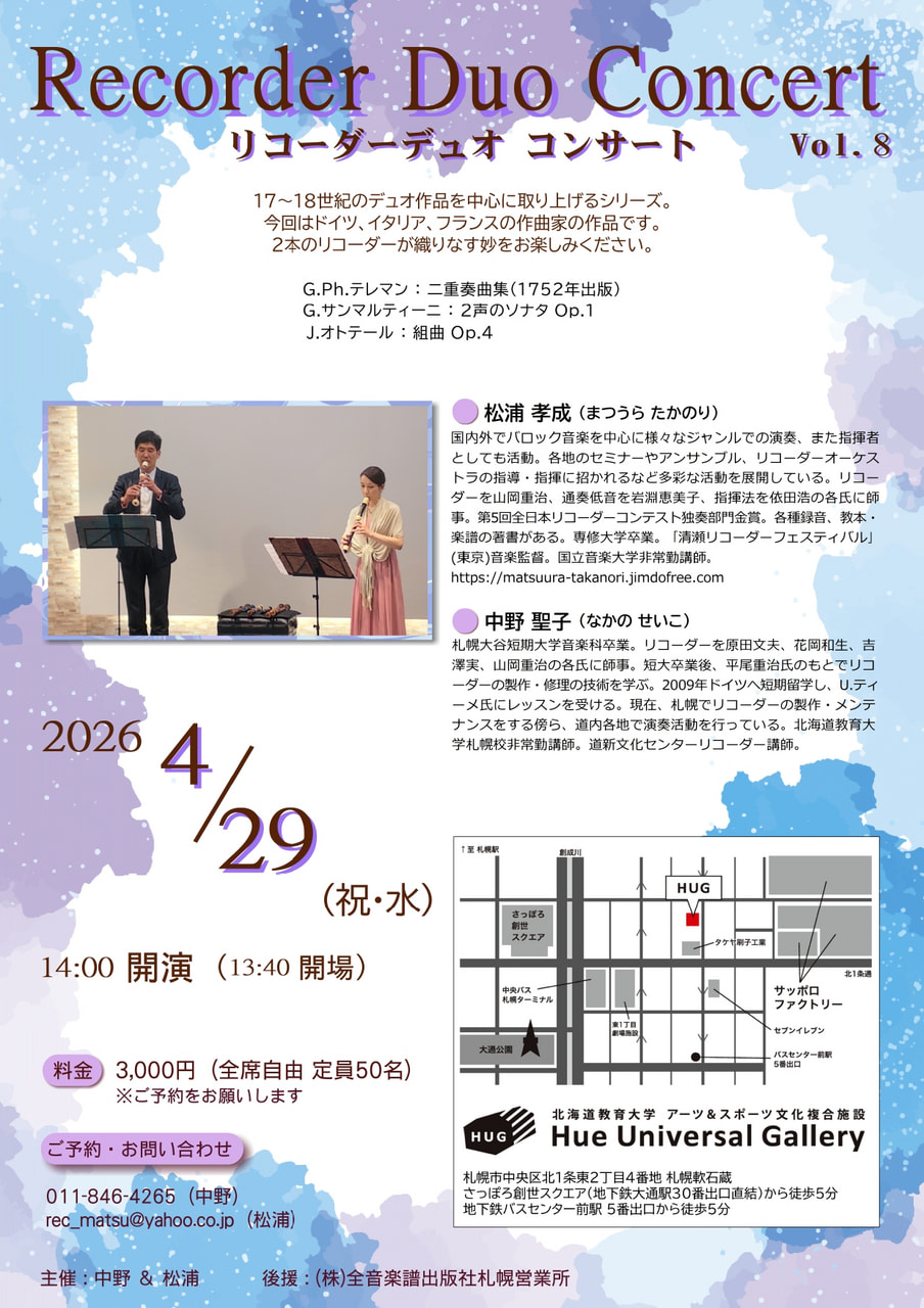 17〜18世紀のデュオ作品を中心に、ドイツ、イタリア、フランスの作曲家の作品を演奏予定です。