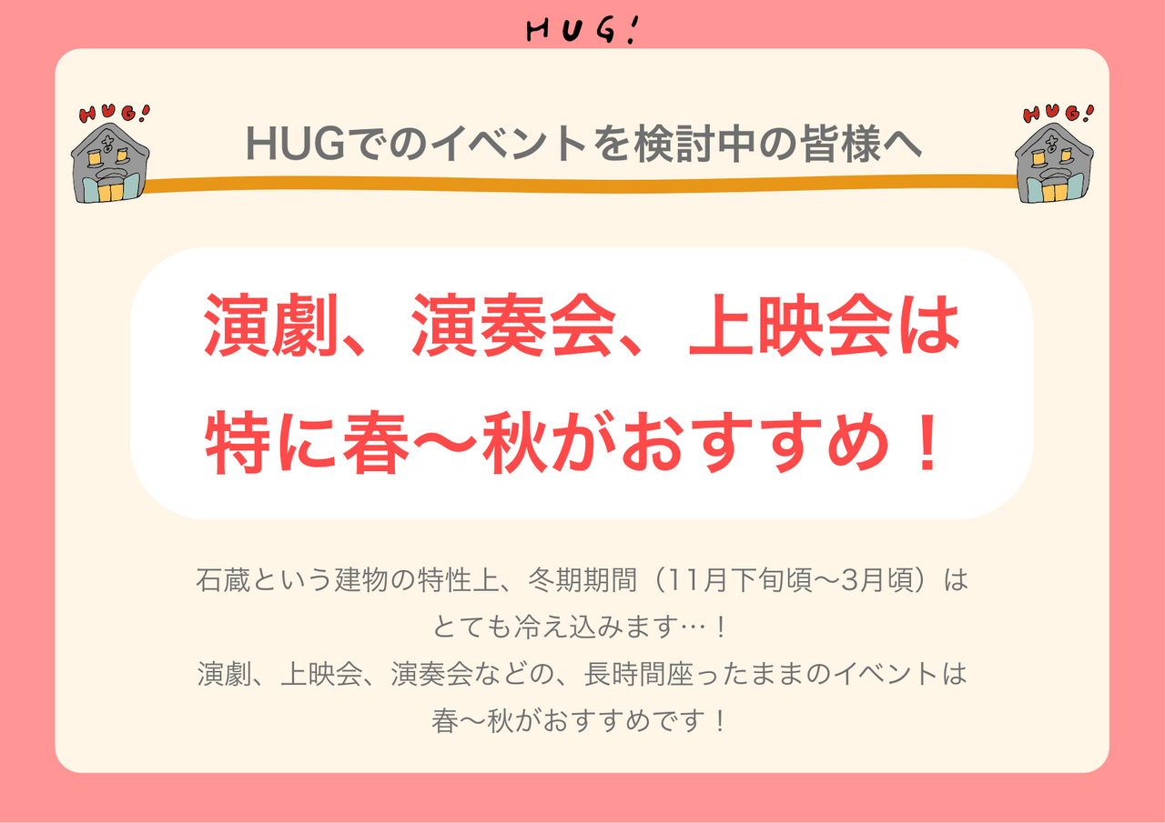 ・HUG職員は時間外の対応ができません。時間外での使用は、施錠できる本学職員が同伴する場合に限ります。準備、後片付け、搬入、搬出、各種レセプションも同様です。