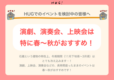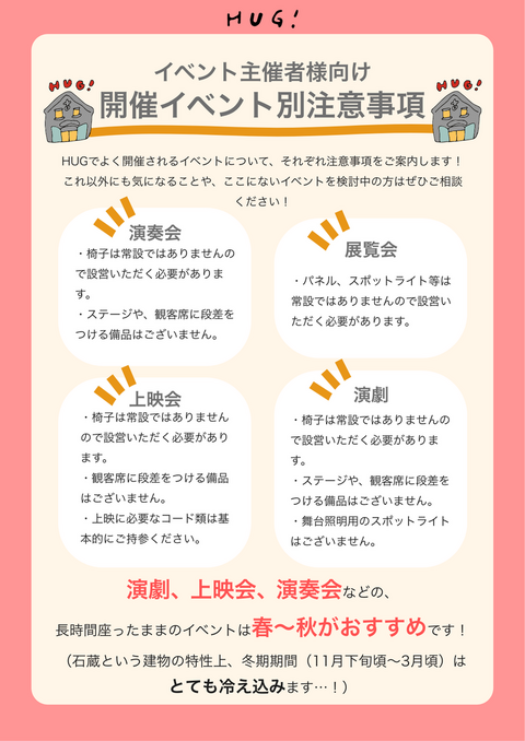 ・3週間前までにデータを提出いただければ、HUGホームページ、Facebook、入り口にある大型モニター、その他媒体を使って宣伝をすることができます。