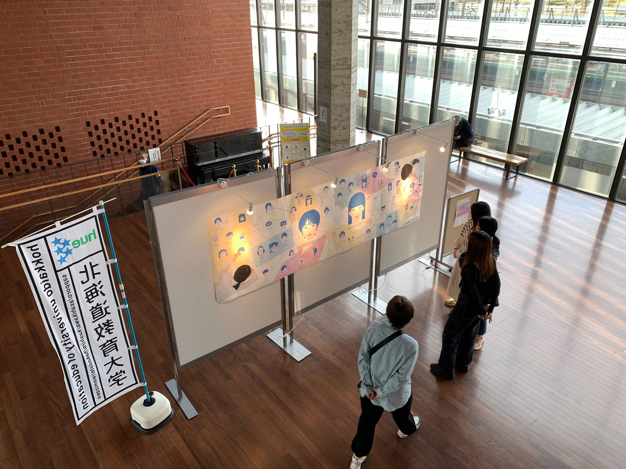 | 内 容 | メディアデザイン研究室4年生の藤田恭平さんと竹生ゆらのさんによるユニット「YURAYURATAKO」によるポスター展示です。 JR岩見沢駅のホール、という設置環境から「ちらっと見るだけでも楽しいし、じっくり見ても楽しい作品を作ろうと思いました。」という藤田さん。展示されたポスターはとても可愛くておしゃれ!…ですが、よく見ると…あれれ?「SUBETE USO」とはいったい何なんでしょう……? オシャレでかわいくて、時間がある限り、“見ささって”しまうポスター2枚の展示でした。 |