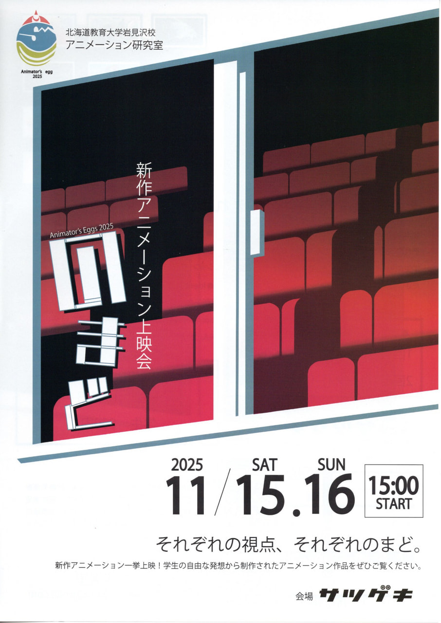 | 内 容 | “それぞれの視点、それぞれのまど。” 北海道教育大学岩見沢校の若手アニメーション作家20めいによるそれぞれの個性が光る新作アニメーション作品を一挙上映! 学生たちのそれぞれの窓から見える景色を是非ご覧ください。 ★☆★PROGRAM★☆★ ・スクエア・ループアニメーション…正方形のフレーム上で、シームレスに繰り返されるモーション。視覚のリズムが、思わずクセになります。 ・Ident…「新千歳空港国際アニメーション映画祭」「Cardiff Animation Festival」の中で上映されるロゴアニメーション。4人の作家が15秒に込めた表現をご覧ください。 |