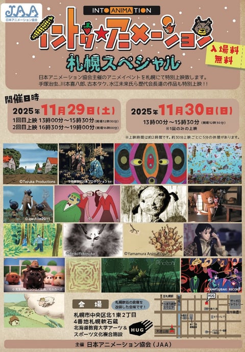日本アニメーション協会主催のアニメイベントを札幌にて特別上映します。北海道学生作品内では、本校の卒業生が制作したアニメーションも上映されます。