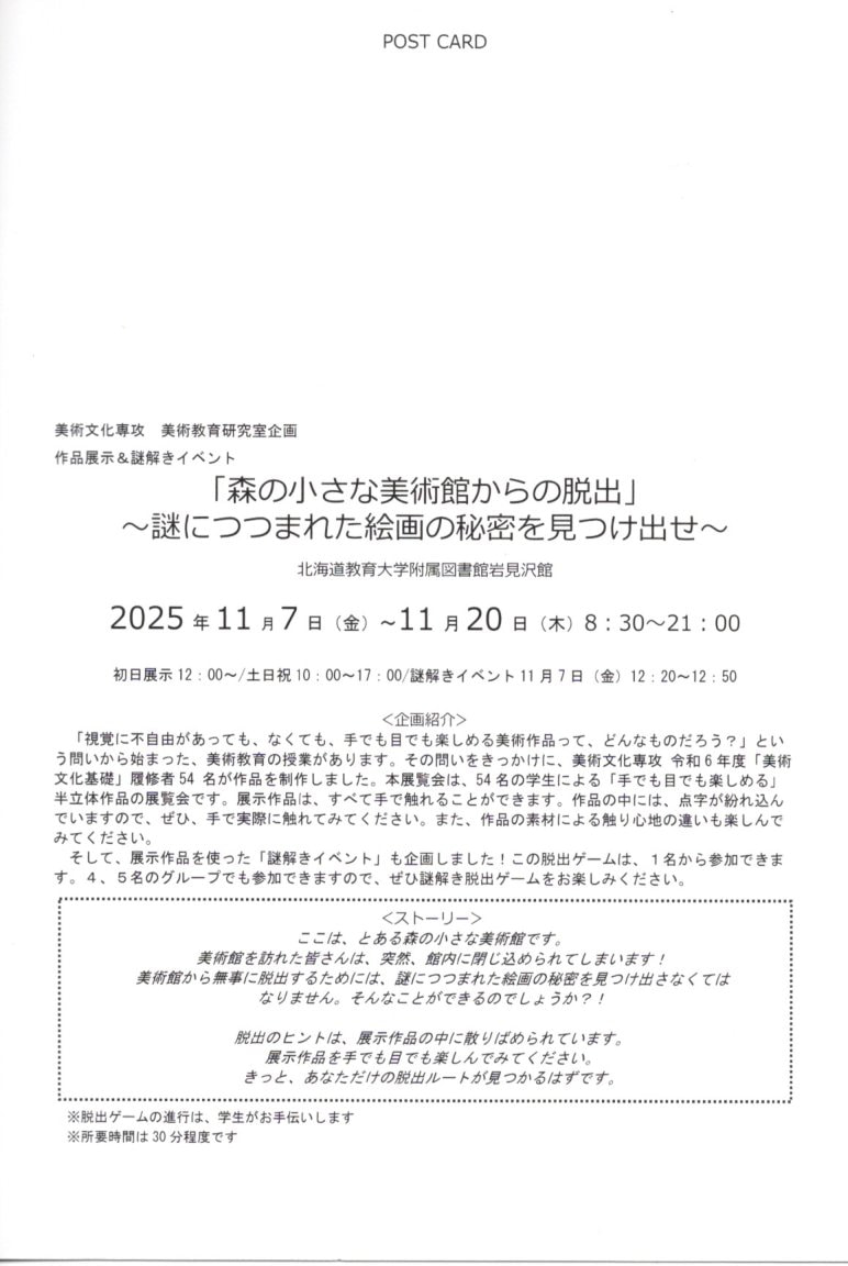 | 内 容 | 美術文化専攻令和6年度「美術文化基礎」履修者54名による、「手でも目でも楽しめる」半立体作品の展覧会です。 展示作品は、すべて手で触れることが出来ます。作品の中には展示が紛れ込んでいますので、是非手で実際に触れてみてください。 一般の方も観覧可能です。入場の際にはカウンターにいる図書館職員にお声がけください。 ※謎解きイベントは終了いたしました。 |