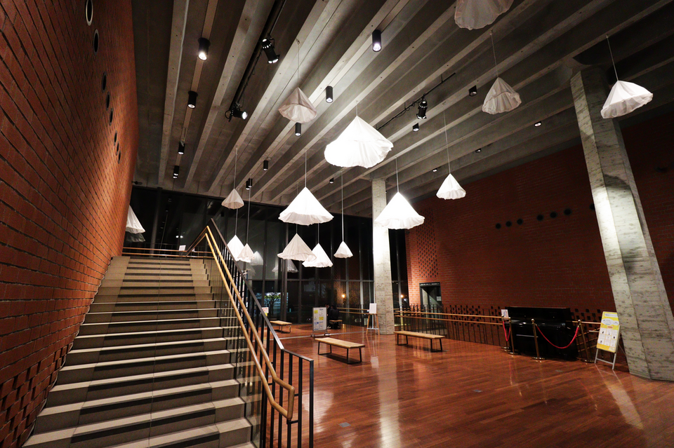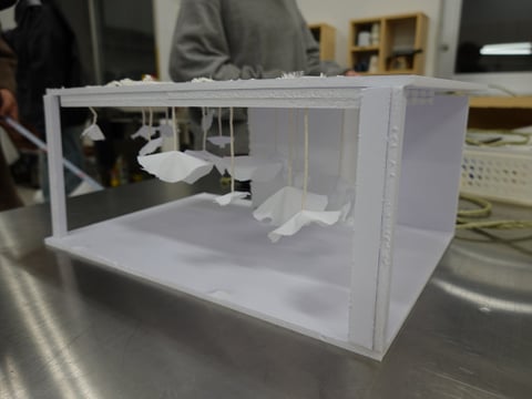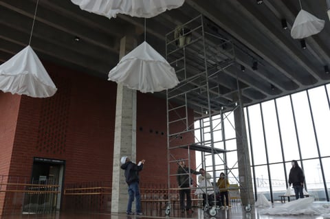 会場は有明交流プラザセンターホール。春先から何度も調整や準備を重ね、設置に至りました。 会場となる駅舎の下見や幾度もの話し合いを経て、「岩見沢の雪」をテーマにした本作品。ターポスクリーンと呼ばれる布を使用した雪山を制作し、駅ホールの天井からいくつもの雪山を吊るしました。 “冬は大変”という印象が強い岩見沢ですが、雪山そのものの美しさを表現したインスタレーションを展示することで、駅舎を利用したり、通りかかった人が雪に思いを馳せたり、その美しさを改めて感じて欲しい…という思いで展示を行いました。 |