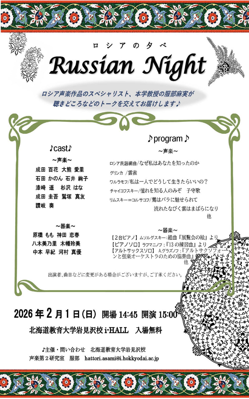 | 内 容 | ロシア生まれの作曲家の名曲を声楽と器楽でお届けします。 本演奏会では、服部麻実教授(声楽第2研究室)がロシア声楽作品のスペシャリストとして、トークを交えて演奏をお届けします。 ★☆★CAST★☆★ 【声楽】成田百花、大熊愛里、石田かのん、石井絢子、漆崎遥、杉沢はな、成田圭吾、鷲塚真友、讃岐奏 【器楽】原橋もも、神田恋春、八木美乃里、木幡玲美、中本早紀、川村真優 |