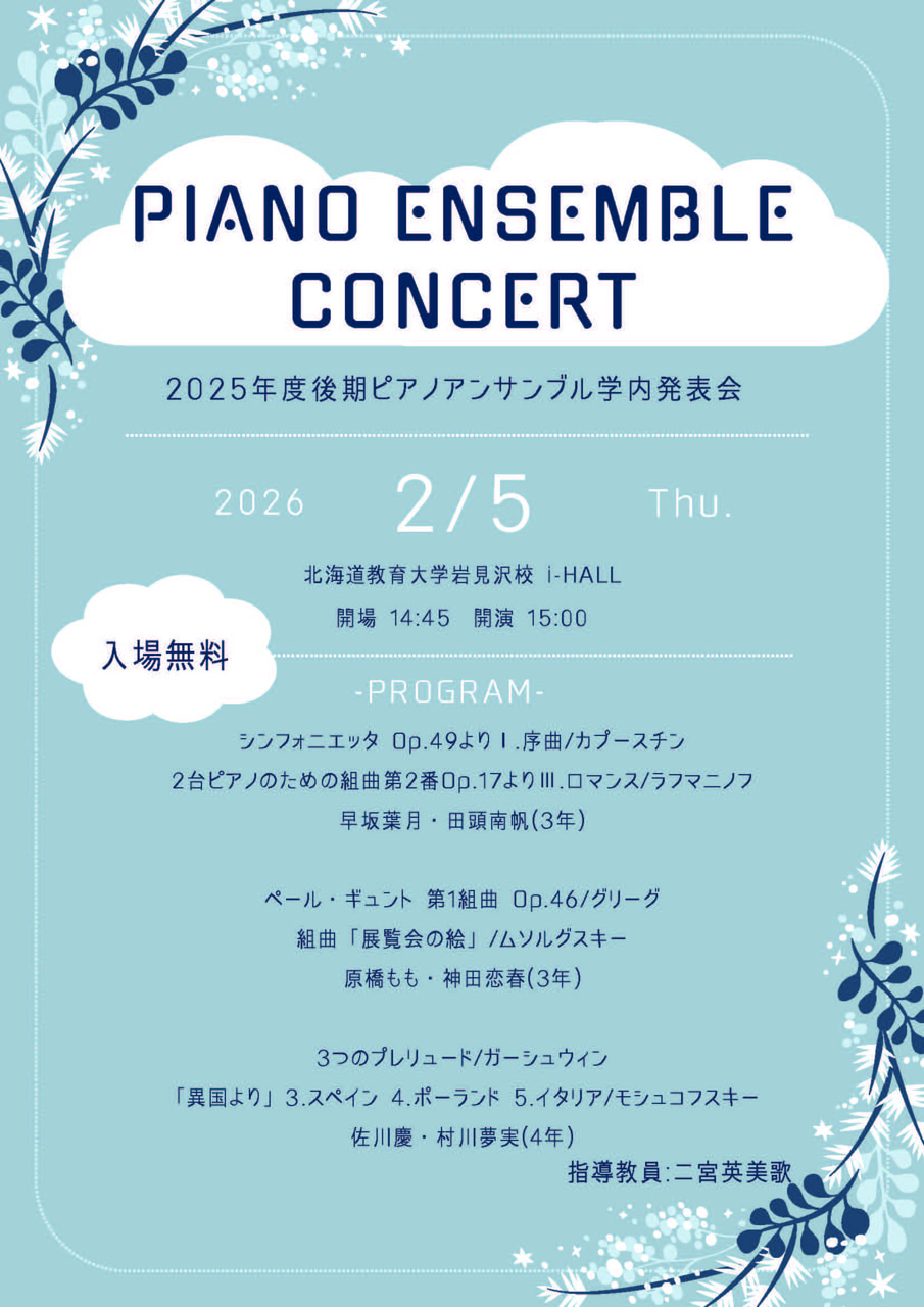 | 演奏会名 | 2025年度後期ピアノアンサンブル学内発表会 |