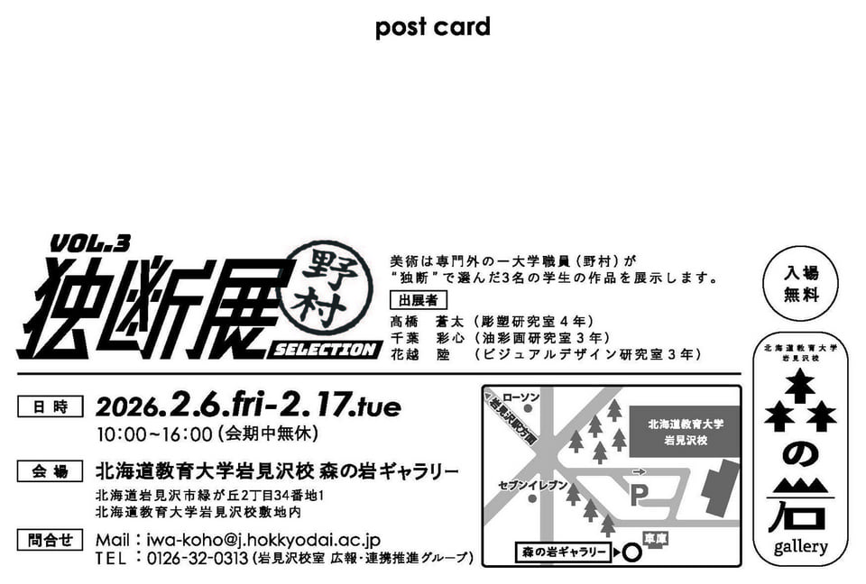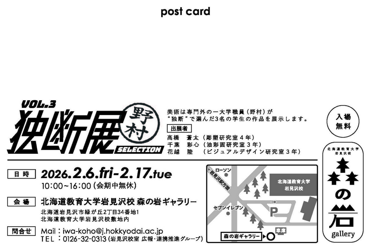 美術は専門外のいち大学職員(野村)が、“独断”で選んだ3名の学生の作品を展示します。