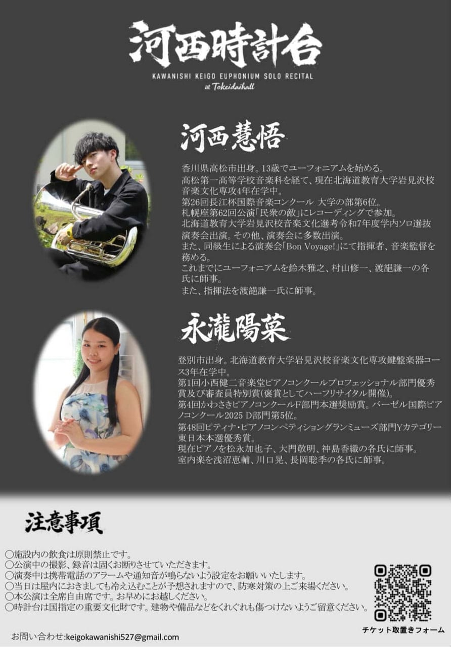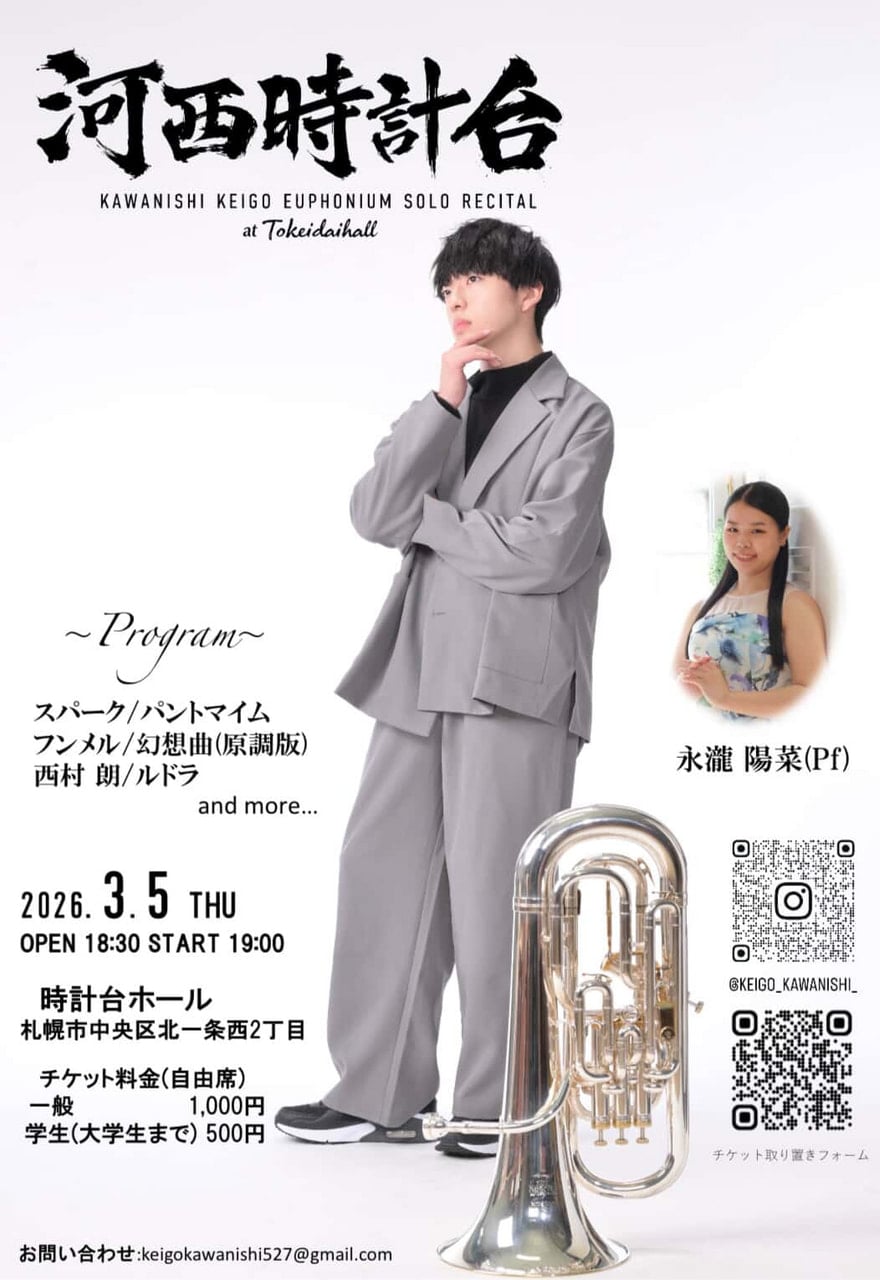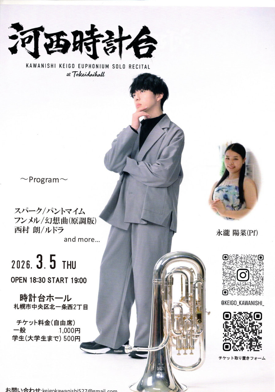 | 演奏会名 | 河西時計台 -KAWANISHI KEIGO EUPHONIUM SOLO RECITAL at TOKEIDAI- |