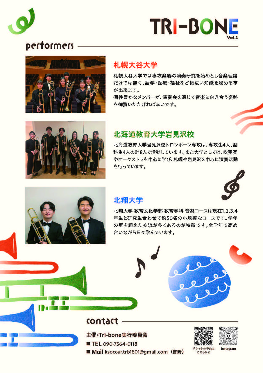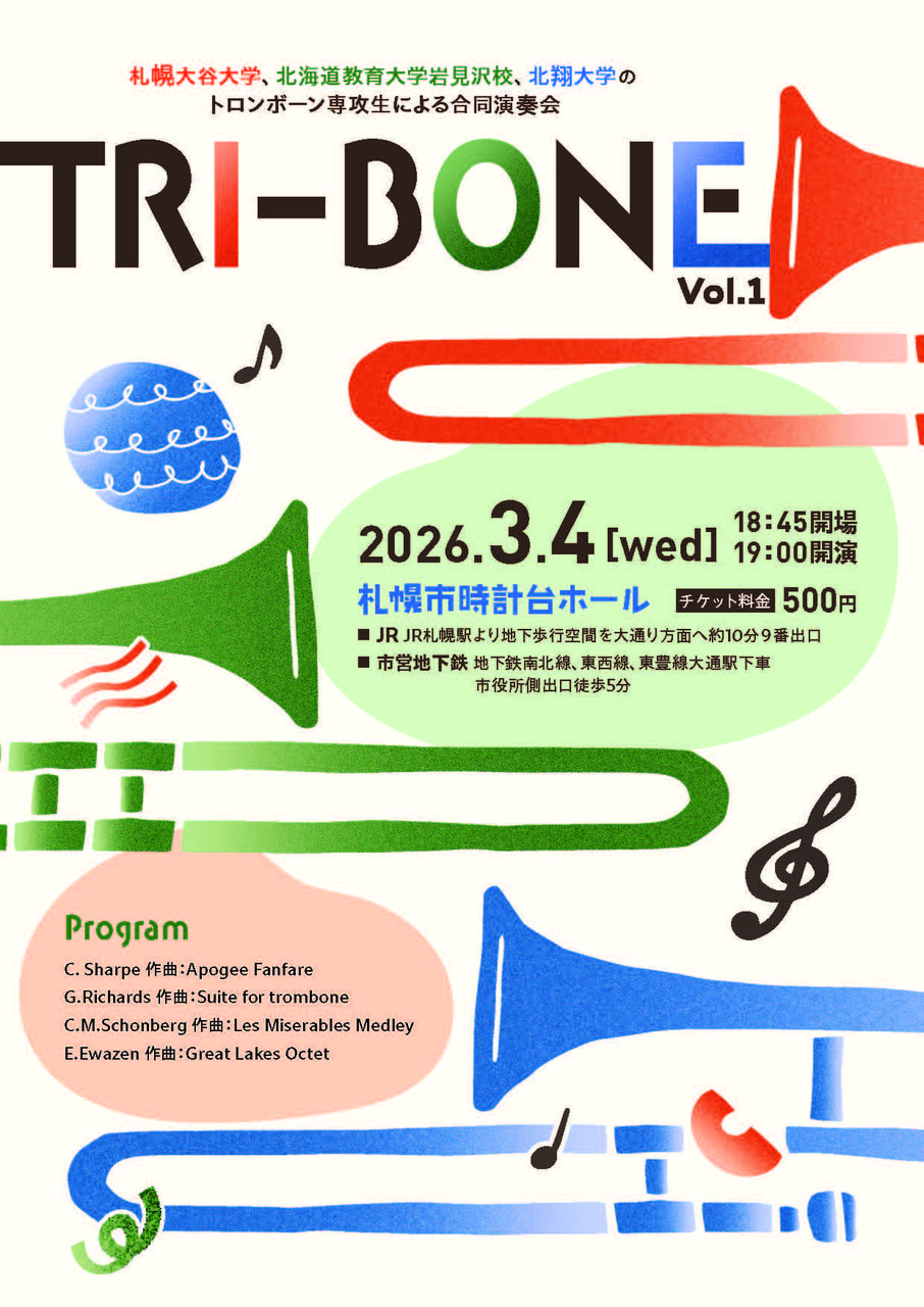 | 内 容 | 北海道教育大学岩見沢校・札幌大谷大学・北翔大学でトロンボーンを専攻する学生による演奏会です!