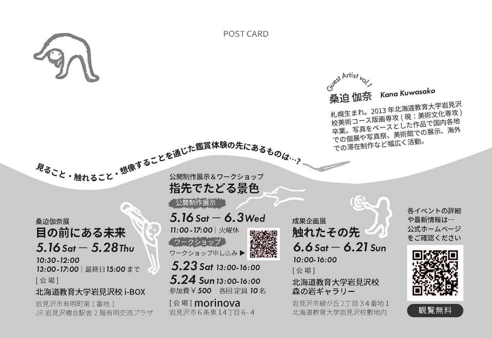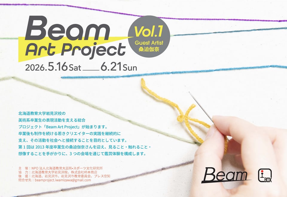 北海道教育大学岩見沢校の美術系卒業生の表現活動を支える総合プロジェクト「Beam Art Project」が始まります。 卒業後も制作をつづける若きクリエイターの実践を継続的に支え、その活動を社会へと接続することを目的としています。 第1回は2013年度卒業生の桑迫伽奈さんを迎え、見ること・触れること・想像することを手がかりに、3つの会場を通じて鑑賞体験を構成します。 i-BOX会場では、写真や言葉、ドローイングなど多様な手法により、桑迫伽奈氏の近作「masa hadapan」を再構成した展覧会を開催します。 「時間」や「未来」をテーマとしたアンケートも実施し、その結果は6月6日から開催の「触れたその先」の展示作品の一部に反映されます。 |